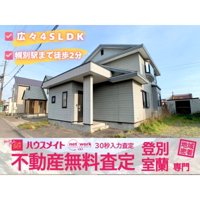 『家族の笑顔が集う、駅近4SLDKのゆとり空間。』JR幌別駅まで徒歩2分!通勤・通学に便利な好立地の一戸建てです!日当り良好な整形地で、閑静な住宅街に位置しています。登別中央ショッピングセンターアーニスやスーパー、病院、郵便局も徒歩5分圏内に揃い、日々の暮らしを快適にサポート!生活利便性の高い場所で新生活を始めませんか?各居室に収納があり、ウォークインクローゼットや物置も完備で収納力も充実☆☆IHクッキングヒーター付きのシステムキッチン、トイレ2ヶ所以上、浴室1坪以上など、水回り設備も整っています!北海道の冬も安心の灯油暖房で快適な室内環境です!この魅力的な住まいで、新しい生活を始めてみませんか?詳細はハウスメイトネットワーク登別室蘭店までお気軽にお問い合わせください!!